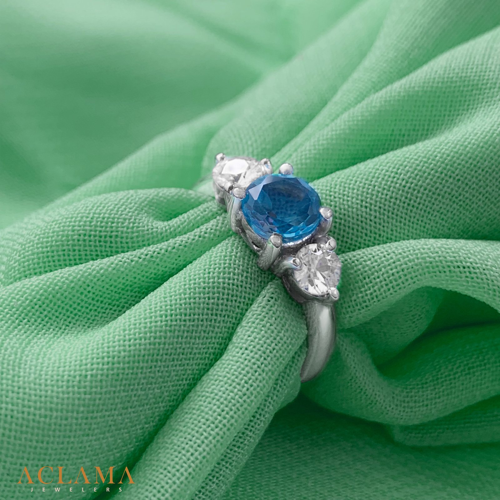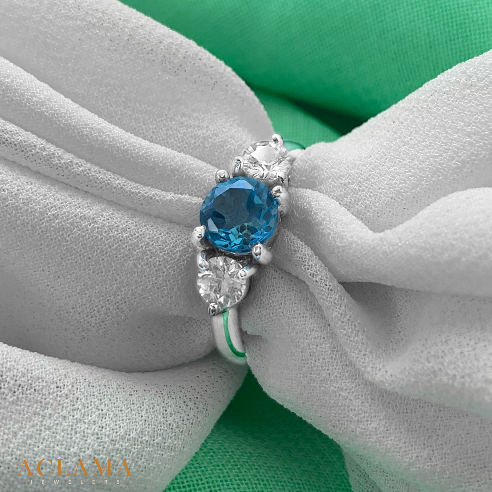 Crafted in sterling silver, this ring is set with a hand picked round blue topaz, framed by two American diamonds.