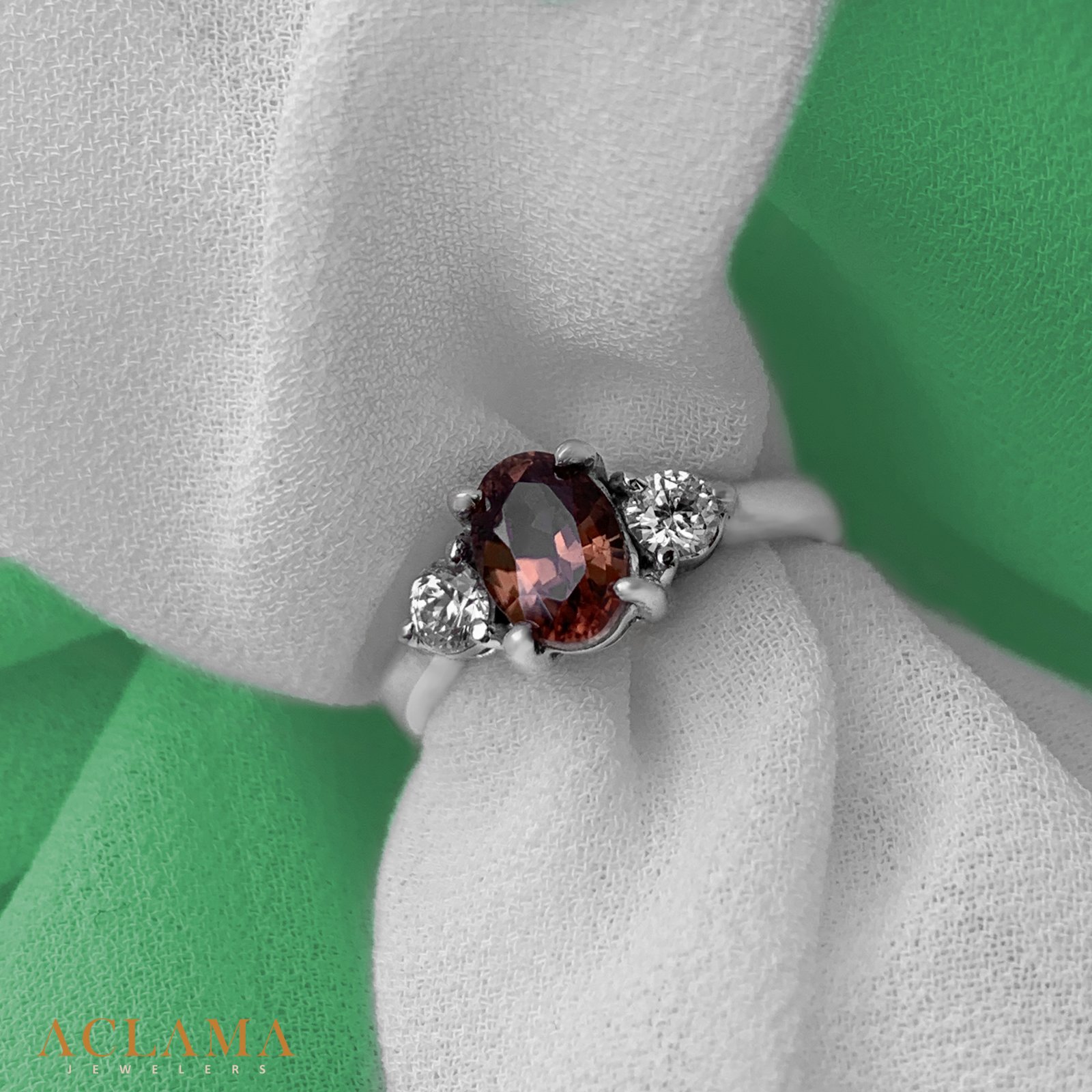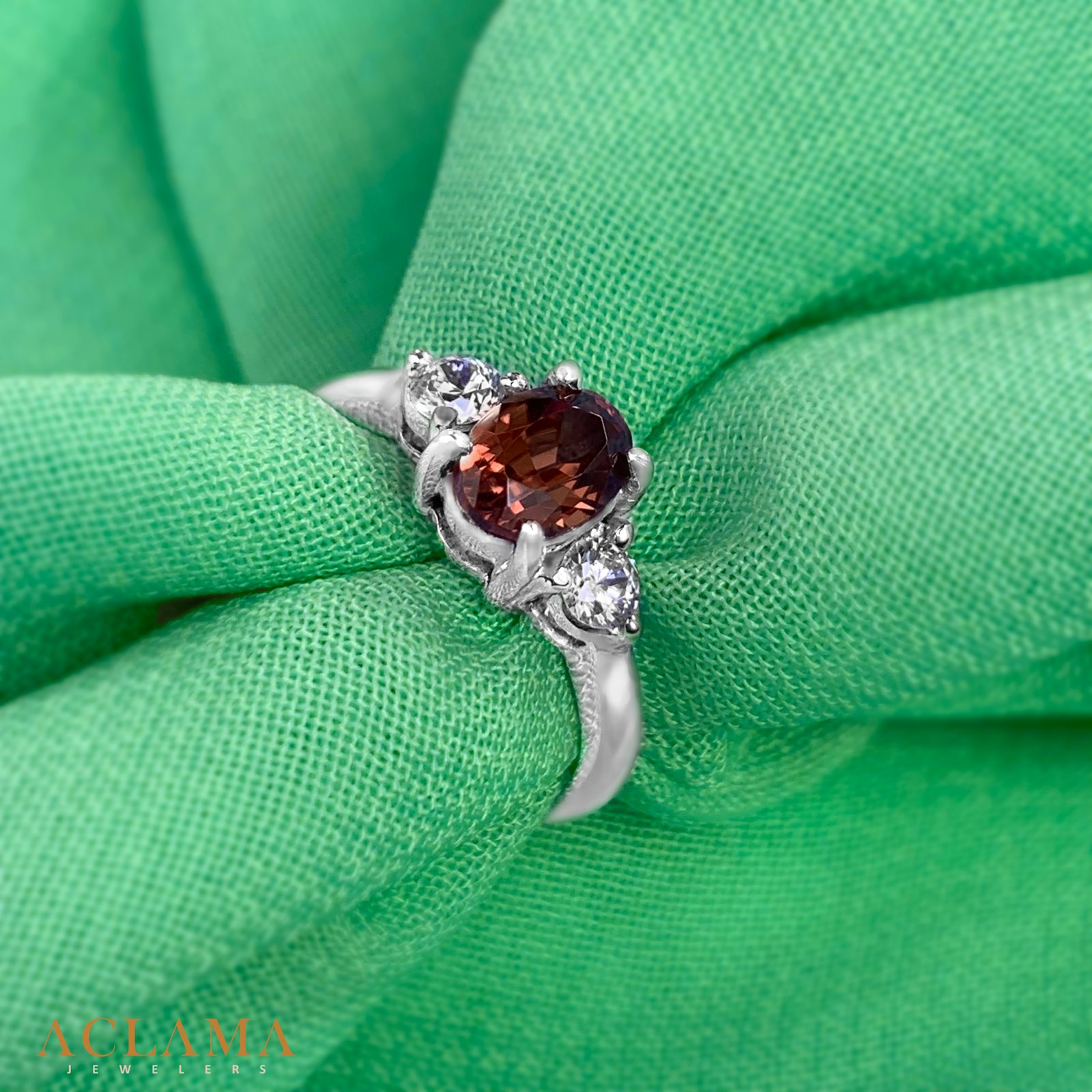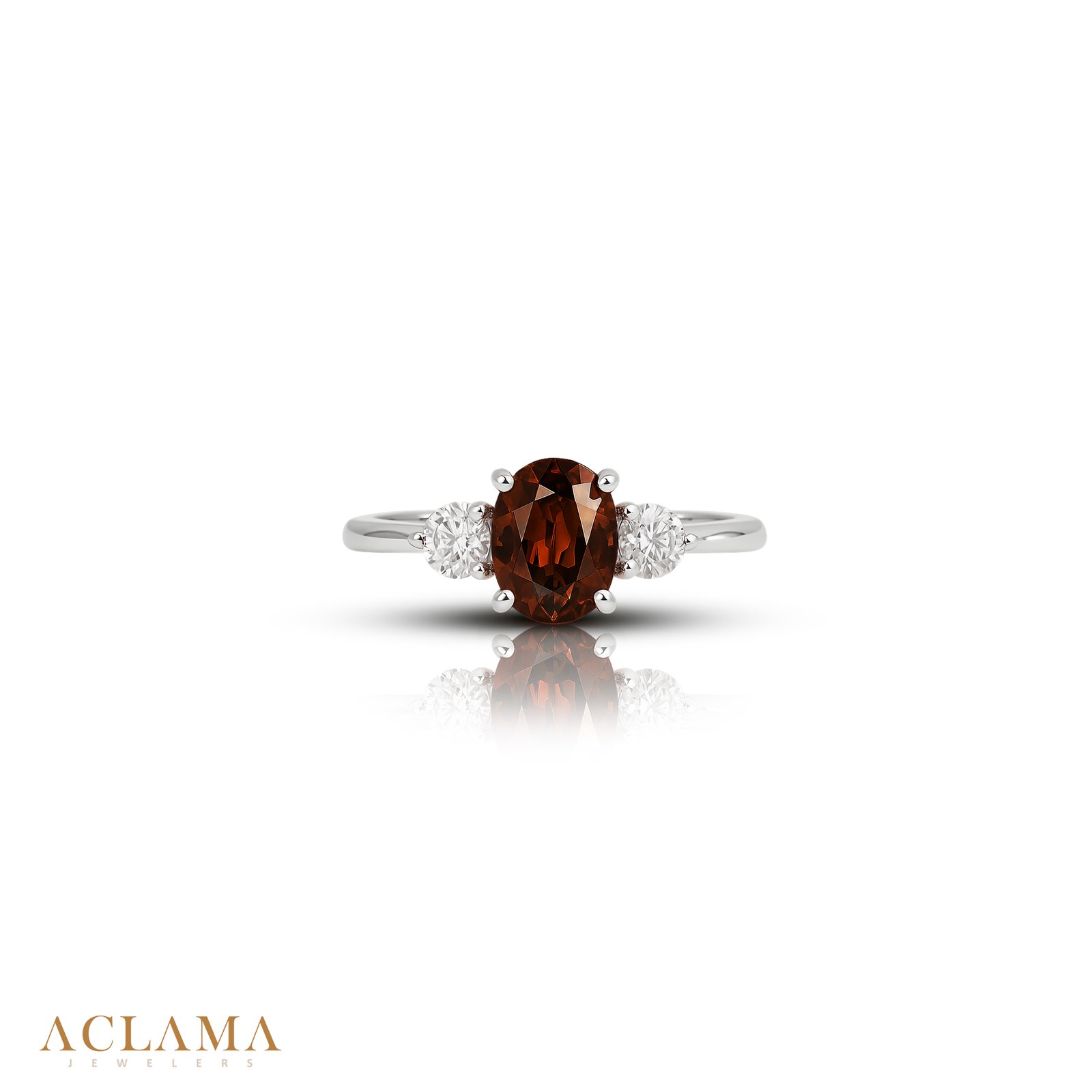 Crafted in sterling silver, this ring features a natural zircon with warm, earthy tones, framed by two sparkling American diamonds.