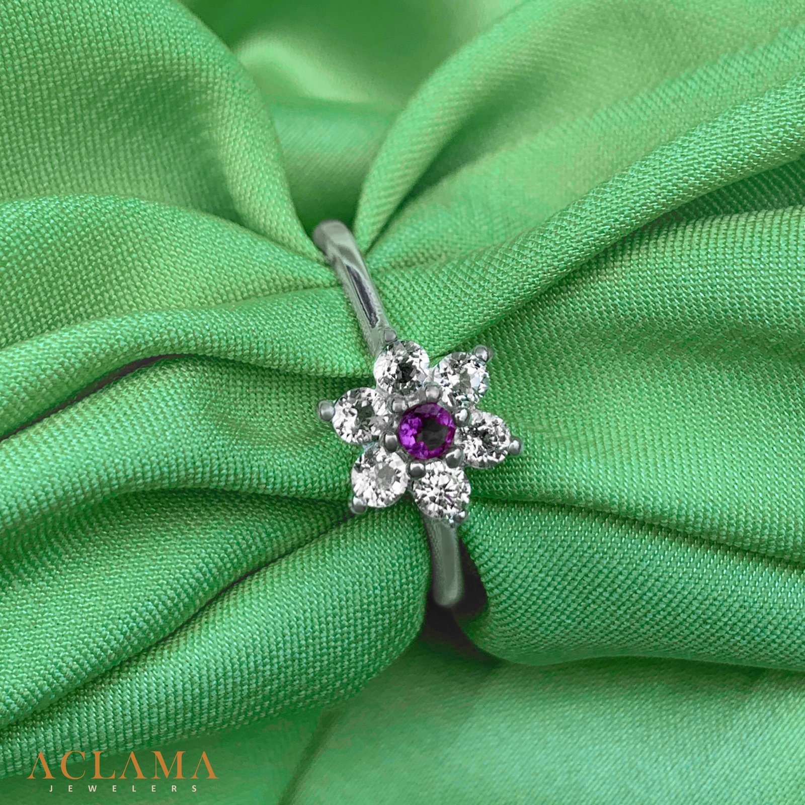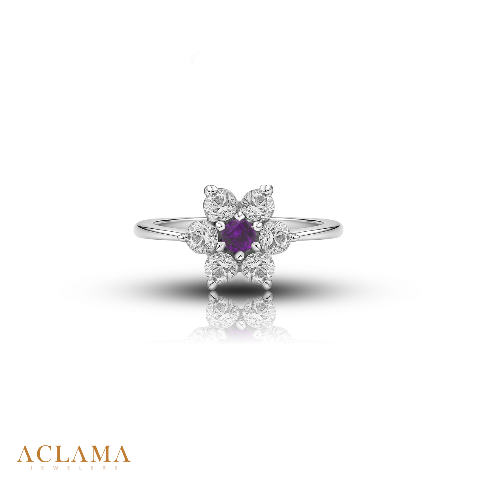 Crafted in sterling silver, this ring features a natural amethyst at its heart, embraced by six sparkling white topaz stones.